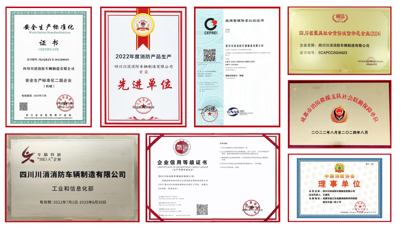 四川川消车辆公司通过了GB/T 19001 / ISO 9001质量管理体系、GB/T 24001 / ISO 14001环境管理体系、GB/T 45001 / ISO 45001职业健康安全管理体系认证,同时也是国家“十二五”、“十三五”、“十四五”消防科研项目重点参与单位、国家部局科研项目参与单位及国家标准、行业标准编制参与单位。